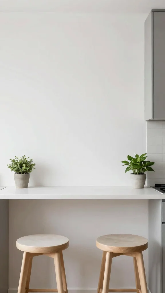 A ledge breakfast bar is a clever way to utilize vertical space in small kitchens. This design allows for a narrow countertop that extends from the wall, creating a perfect spot for quick bites or coffee. Picture a slim ledge crafted from a durable material, offering just enough space for a couple of stools, decorated with a small potted plant to enhance its visual appeal.
