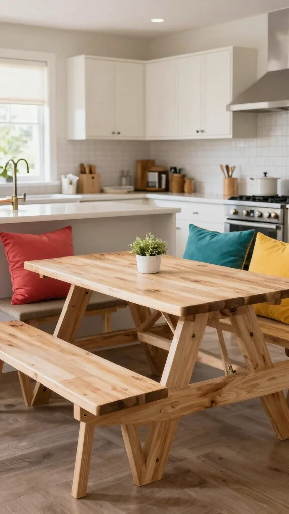 A picnic table-style breakfast bar brings a playful and unique element to small kitchen dining. This design mimics a classic picnic table while being compact enough for indoor use, encouraging casual meals at home. Visualize a small picnic-style table complete with attached benches, perfect for light snacks or meals, enhanced by colorful cushions or a cheerful tablecloth.