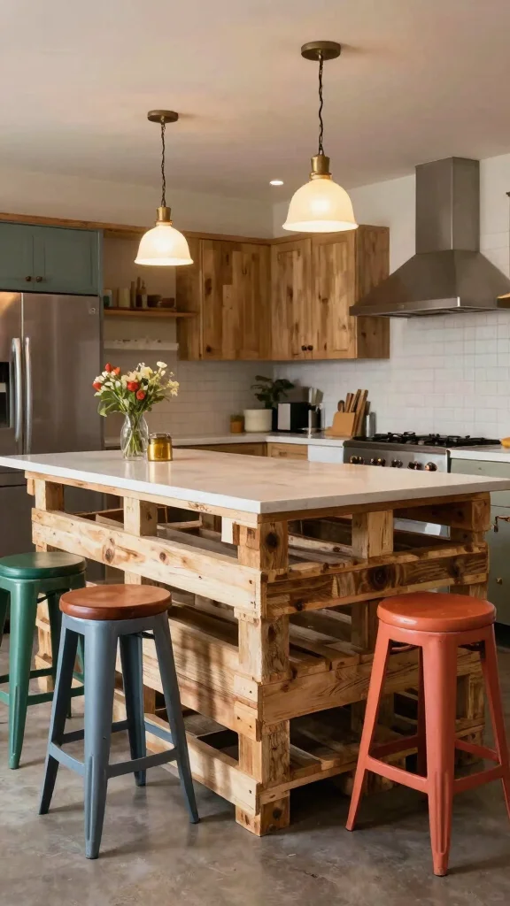 For those with a creative spirit, a DIY pallet breakfast bar offers a fun and budget-friendly project. This design is customizable, eco-friendly, and adds a rustic touch to your kitchen, allowing for personal expression. Imagine two pallets stacked to create a sturdy base, topped with a smooth countertop, and complemented by colorful stools and hanging lights.