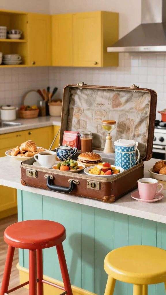 To make the most of this concept, select a sturdy suitcase in good condition. Decorate the area with vintage kitchen items to enhance the theme. This idea fits beautifully with the trend of incorporating personal touches in home decor.