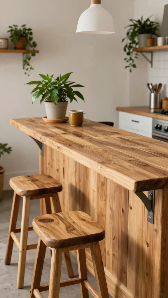 A rustic wooden plank bar adds warmth and character to a small kitchen, creating an inviting space for breakfast. Crafted from reclaimed wood, this type of bar offers an eco-friendly solution while enhancing your kitchen’s aesthetic. Picture a robust wooden plank supported by industrial-style brackets, forming a distinctive elevated dining area.