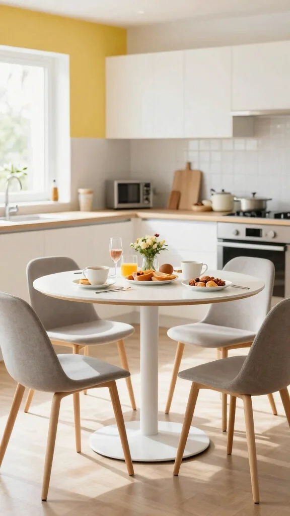 A compact round table set is a fantastic solution for small kitchens, promoting conversation while fitting snugly into tight spaces. Round tables create an inviting atmosphere, making them perfect for casual dining. Picture a bistro-style round table adorned with a centerpiece that easily accommodates two, serving as both a breakfast bar and an elegant focal point.