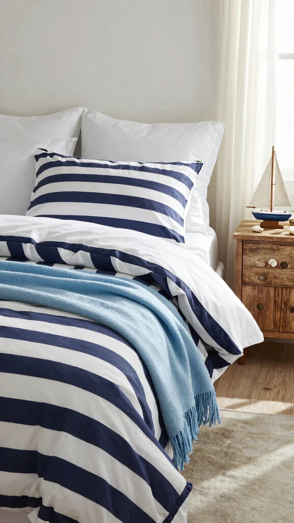 Fun fact: Nautical stripes in blue and white bedding create two visual anchors—the stripes and the texture. Pair a bold striped duvet with solid or textured pillows to instantly pull a coastal vibe into your bedroom, then layer with linen for depth.