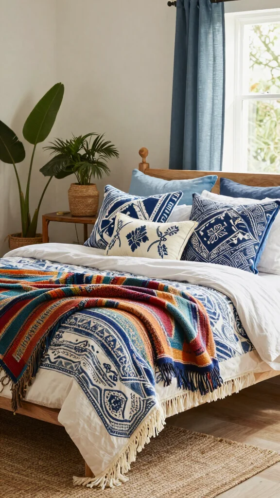 Embrace a relaxed, bohemian vibe by incorporating coastal bohemian bedding into your space. Look for blue and white prints adorned with tassels, fringes, or macramé details that add a carefree spirit to your bedroom while remaining stylish. Pair bohemian bedding with a natural wood bed frame and eclectic decor elements like woven baskets, potted plants, and textured rugs for a cohesive look.