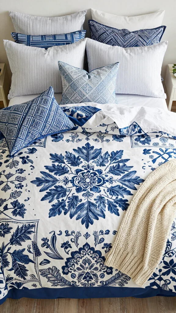 Get ready to elevate your bedroom aesthetic with these blue and white bedding options. From classic nautical stripes to bold geometric patterns, you’ll find something that speaks to your style. These ideas will help you transform your space into a fresh coastal retreat, no matter the season.