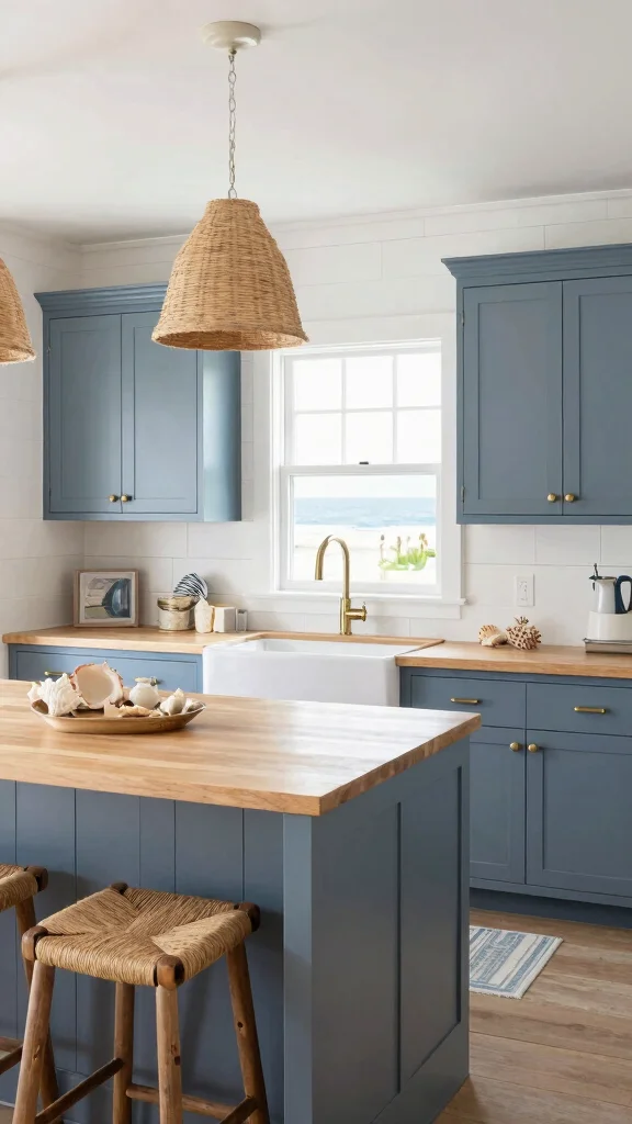 What are the best ways to style blue gray kitchen cabinets for a coastal-inspired look?