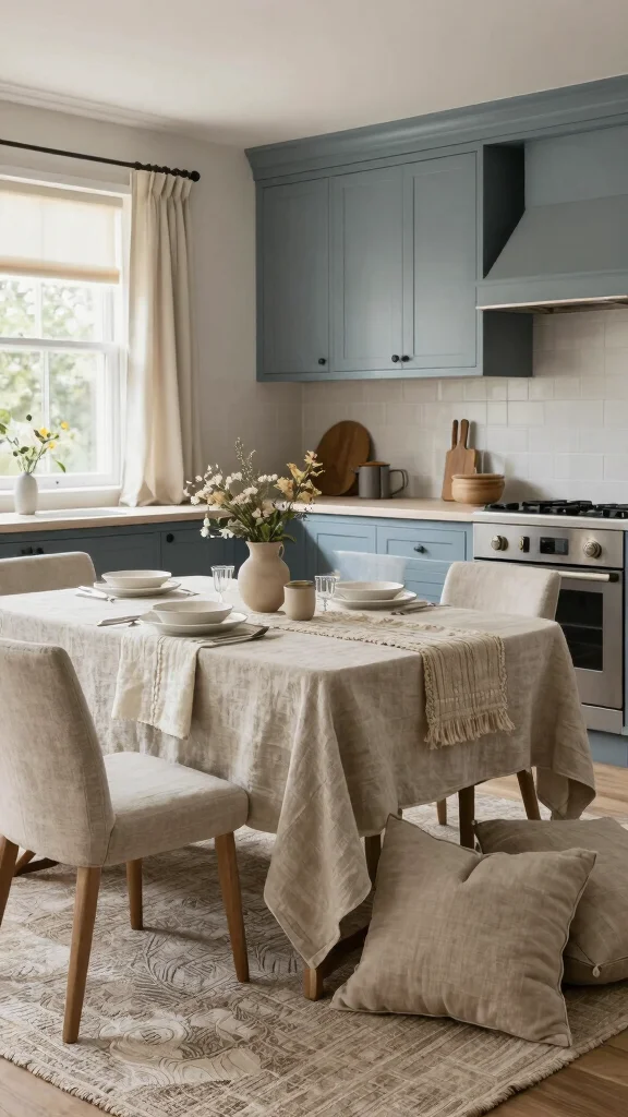 Soft textures and fabrics can beautifully complement blue gray kitchen cabinets, adding depth and warmth to the space. Opt for textiles like linen or cotton for table settings, window treatments, and cushions, enhancing the cozy feel of your kitchen. Textured rugs can provide warmth underfoot, creating an inviting atmosphere.
