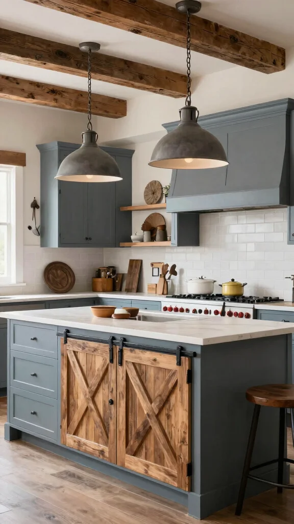 Combining rustic elements with modern blue gray kitchen cabinets creates a stylish and unique kitchen. Think reclaimed wood beams paired with sleek cabinet finishes to strike a balance between warmth and sophistication. Incorporate barn-style doors to enhance rustic charm while maintaining a contemporary feel.