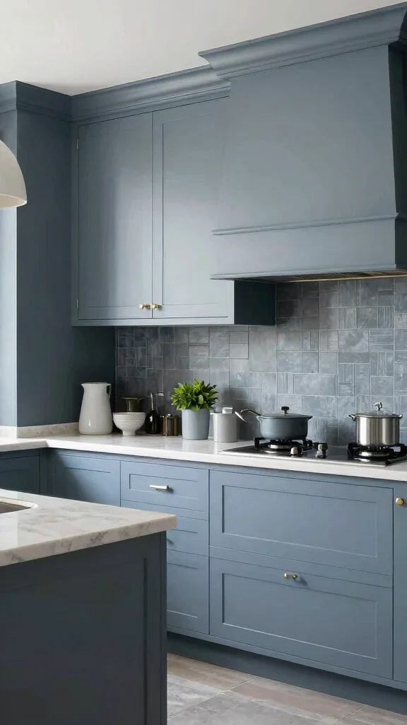 Blue gray is versatile in modern kitchen design. For a crisp, contemporary look, pair blue gray kitchen cabinets with bright white countertops and subtle veining. Add warm wood accents or a light warm-gray floor to avoid a cold feel. If you want more contrast, mix in navy or charcoal elements and metallic hardware in elegant cabinet colors like brushed brass or satin nickel. Finish with a cool or warm backsplash that ties the palette together and keeps the blue gray color scheme cohesive.