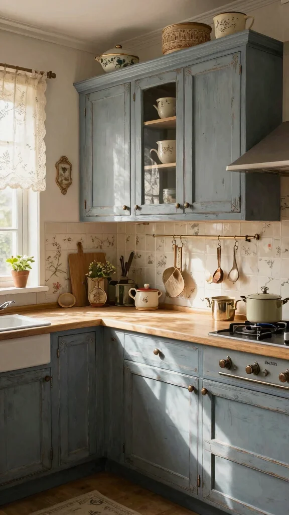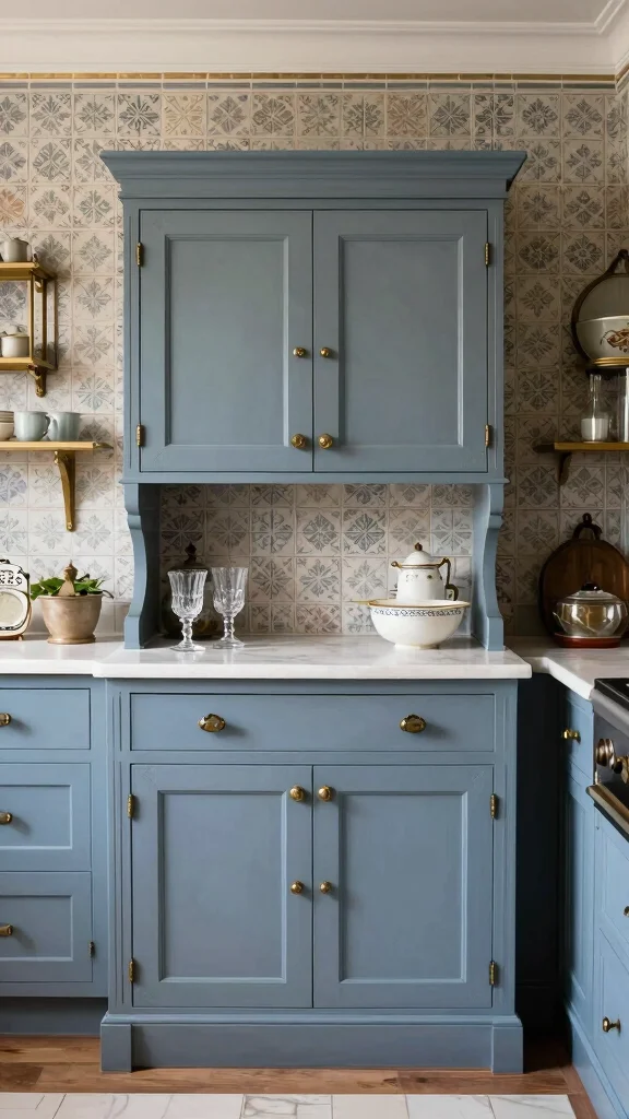 Fun fact: 3 timeless elementsโraised panel doors, ornate hardware, and brass accentsโtransform blue gray kitchen cabinets into vintage elegance. In practice, pairing these with an antique hutch and patterned tiles can add 20 years of charm in 2 simple swaps.