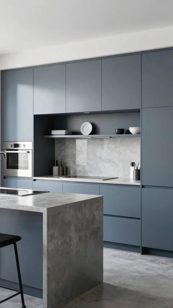 Modern minimalism shines in a kitchen adorned with blue gray cabinets that embody sleek sophistication and simplicity. The high-gloss finish of these cabinets reflects light, making your kitchen feel larger and more open. This style pairs beautifully with stainless steel appliances and cool concrete countertops, offering an industrial yet refined aesthetic.