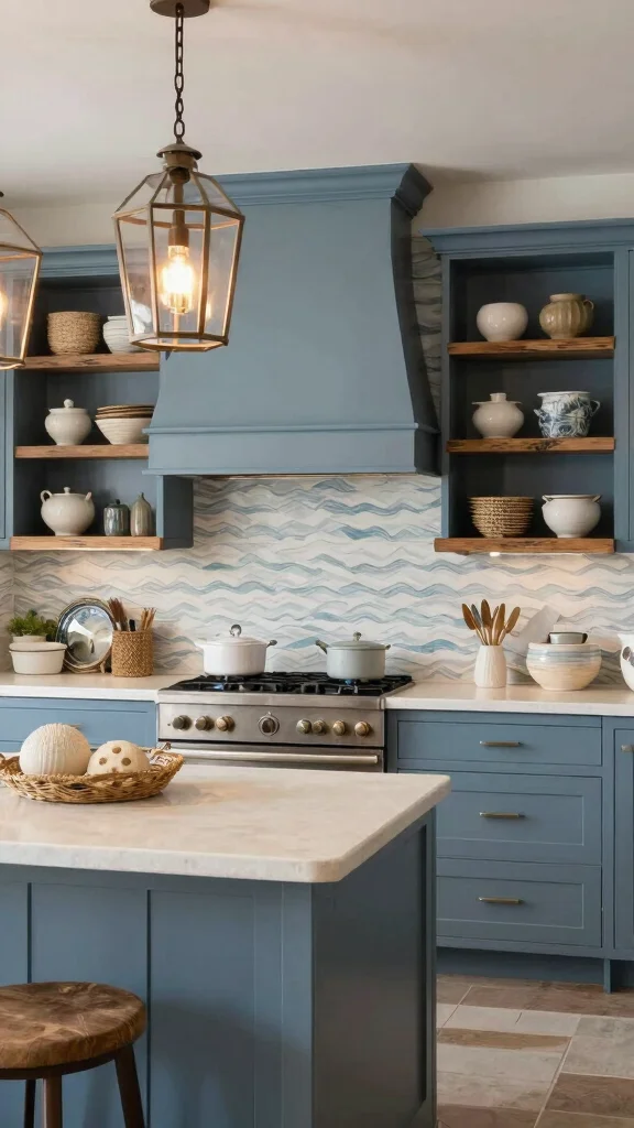 Pair these cabinets with reclaimed wood for open shelving, adding warmth to the coastal aesthetic. This blend of colors and materials invites a serene atmosphere, perfect for a relaxing cooking space.
