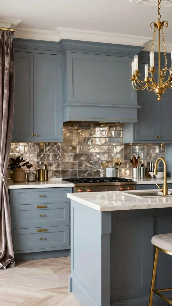 Integrating metallic touches into blue gray kitchen cabinets can elevate the overall sophistication of your space. Consider using brass or gold hardware that creates a striking contrast, adding a touch of glamour to the design. A bold backsplash with metallic tiles catches the light beautifully, crafting a stunning focal point in your kitchen.