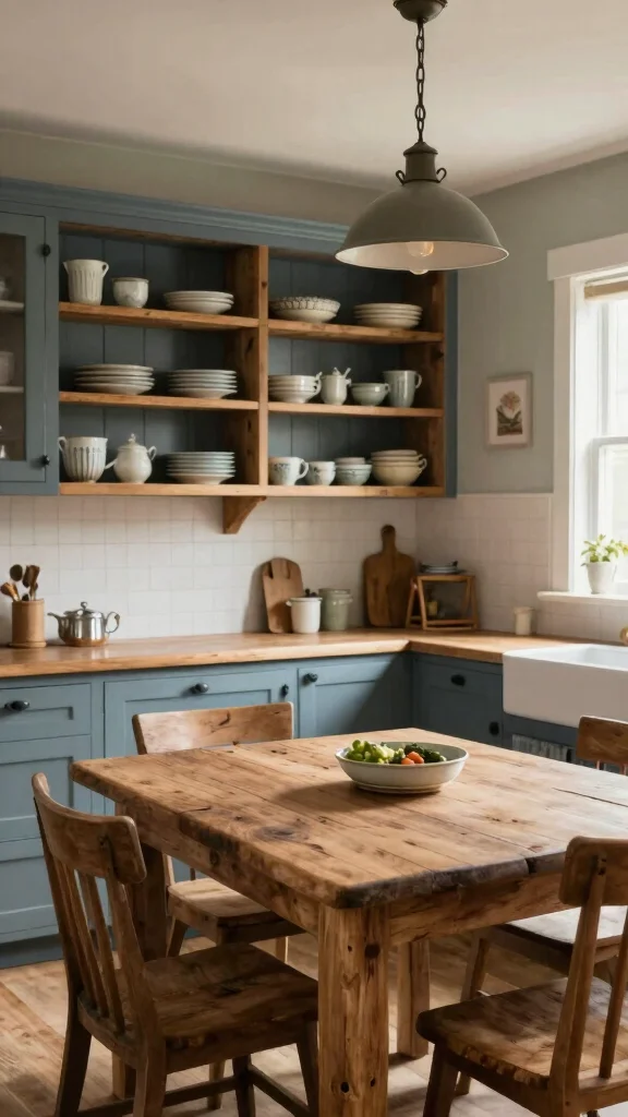 Vintage-inspired lighting fixtures can add character, while soft, muted colors in wall decor enhance the relaxed ambiance, making it ideal for a family kitchen.