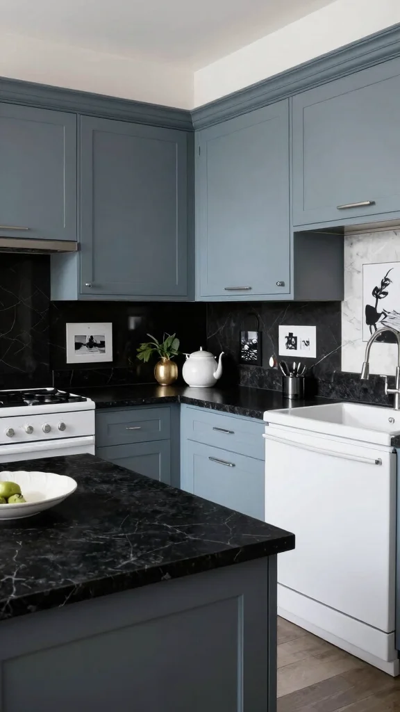 For a striking modern look, consider pairing blue gray kitchen cabinets with high contrast details. Dark countertops, such as black granite or deep charcoal quartz, create an eye-catching contrast against the softer cabinet color. Bright white or glossy accents in decor items, including appliances and wall art, can further enhance this bold aesthetic.