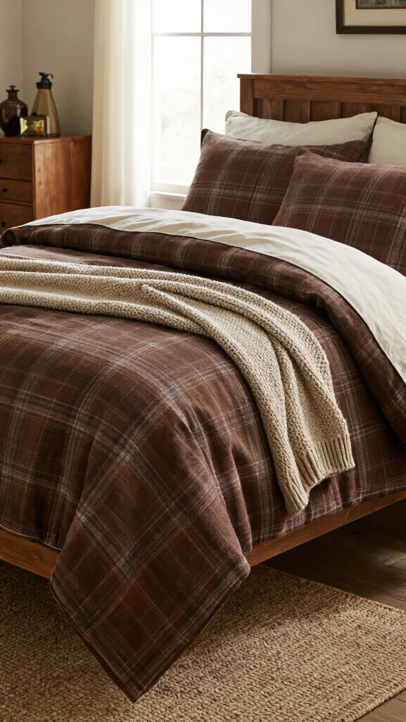 A rustic brown plaid comforter set can infuse your bedroom with a warm, inviting atmosphere. This design combines rich brown tones with soft white accents, creating a harmonious balance that radiates coziness. Layer the comforter with solid white or taupe sheets to create a pleasing contrast that feels both stylish and welcoming. Add knitted throws and chunky pillows to enhance the rustic charm and texture of your space.