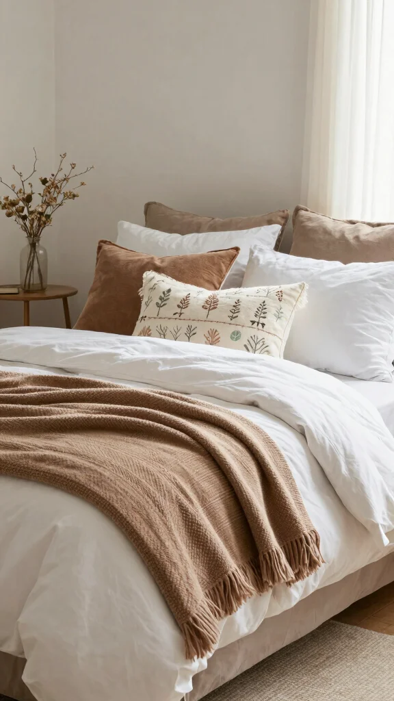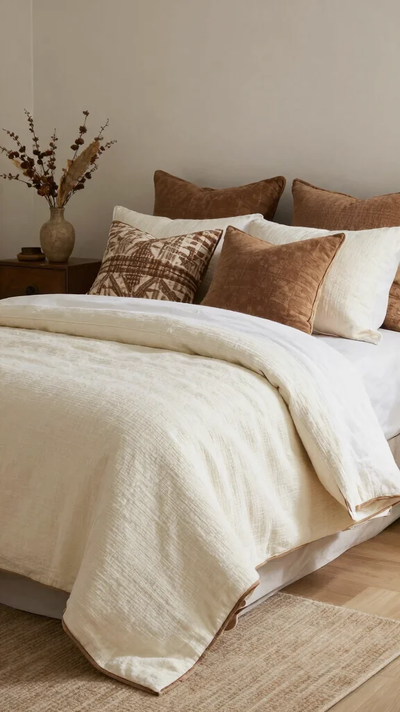 Begin with brown and white bedding as the anchor in a room built on natural style decor. Layer with tactile textures like linen sheets, a cotton quilt, and a chunky knit throw. Add earth tone bedding accents through throw pillows and a woven rug in browns and creams. Keep furniture in warm wood tones and bring in a touch of greenery. This simple layering is one of the most practical cozy bedding ideas that delivers warm bedding inspiration.