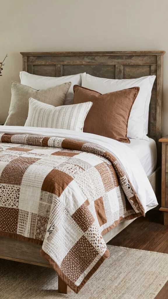 A farmhouse chic patchwork design can bring a unique charm and warmth to your bedroom. Select a quilt featuring a variety of brown and white patterns to create a cozy, inviting atmosphere. Layer this quilt with coordinating solid-colored pillows for a balanced and harmonious look. This style easily fits into rustic or shabby chic themes, making it versatile for any decor.