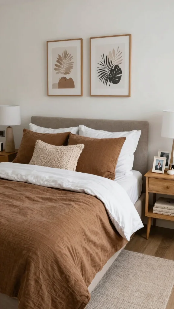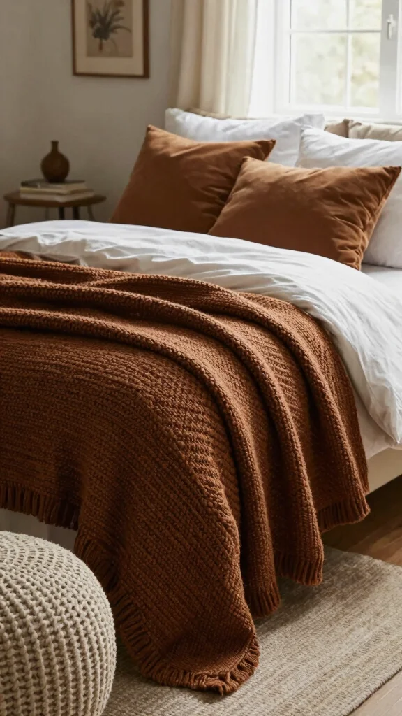 Nothing enhances a cozy atmosphere like a soft knit throw blanket draped elegantly over your bed. Choose a rich brown hue that complements your bedding, or opt for a mix of brown and white in a textured pattern. This addition not only brings warmth but also adds a layer of visual interest that can transform your space. Place it at the foot of your bed or casually over a chair to create that effortless, inviting look.