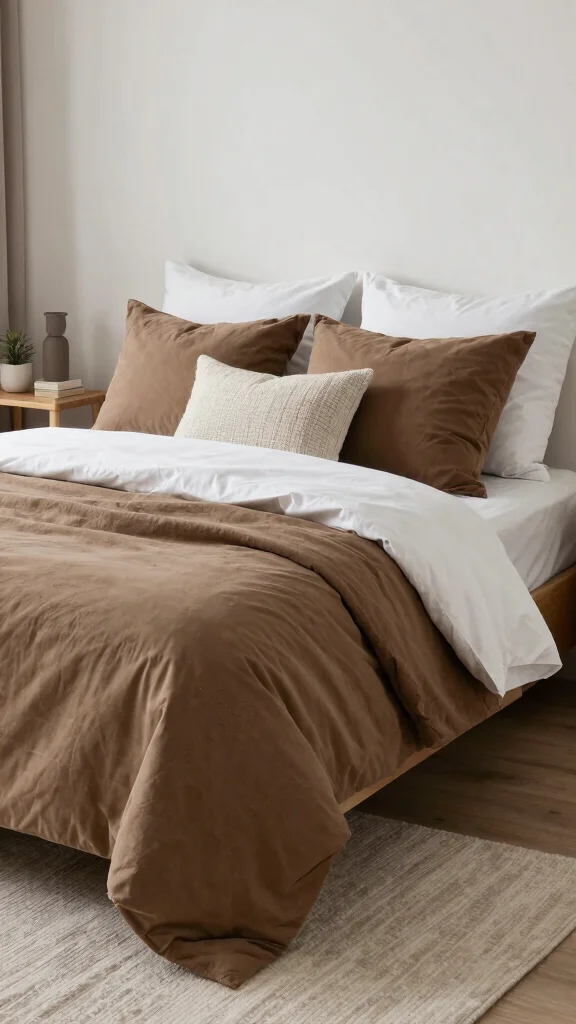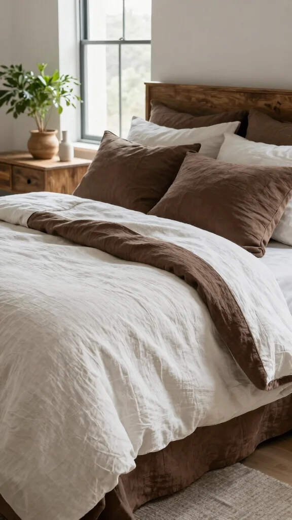 Linen bedding offers a perfect blend of style and comfort for your bedroom. A white linen duvet paired with deep brown linen sheets creates a relaxed yet sophisticated look that feels inviting. The unique texture of linen adds a tactile element, encouraging you to sink into bed. Layer in different shades of brown with throws and decorative pillows to enhance the cozy, refined atmosphere.