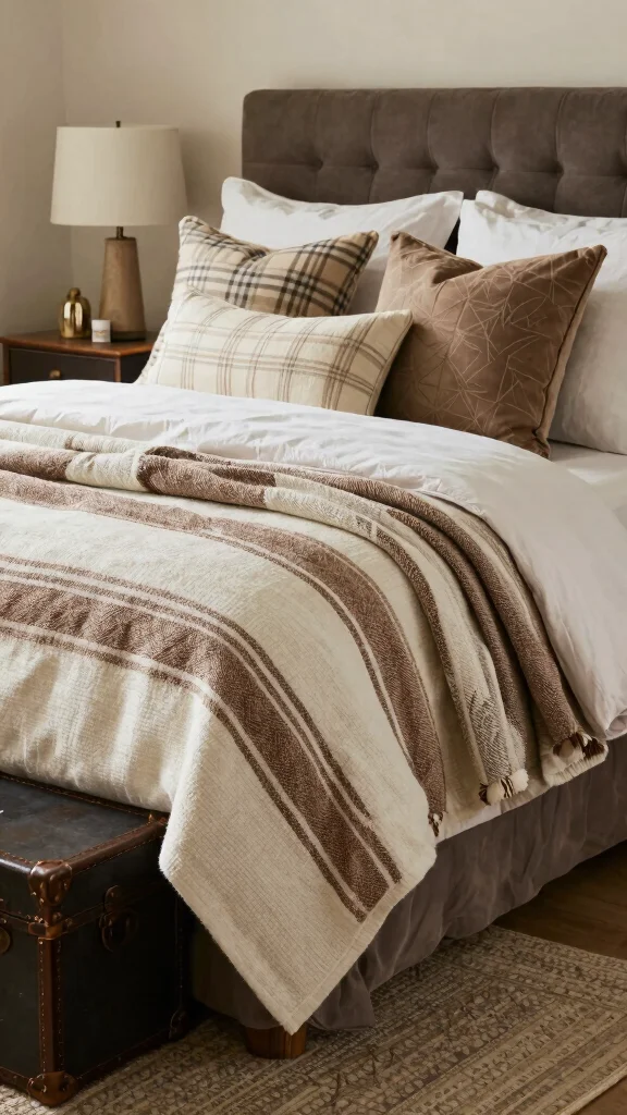 What textures pair best with brown and white bedding for a warm, cozy vibe?