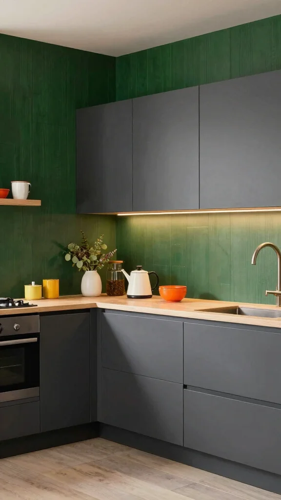 Incorporating bold patterns into your kitchen design adds an eye-catching flair to dark grey cabinets. Consider using patterned wallpaper or unique tile designs that complement the dark tones, enhancing the kitchen’s contemporary appeal.