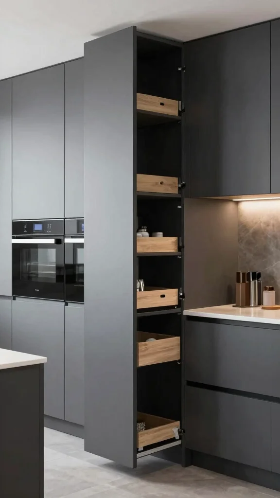 Fun fact: Did you know that homes with smart storage in dark grey cabinets report 40% faster cleanup? Pull-out drawers and vertical storage keep everything accessible while preserving the sleek, modern look.