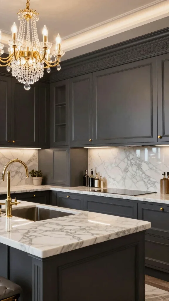 To enhance your dark grey kitchen, use marble countertops that add a touch of luxury while perfectly complementing the cabinetry. Incorporate decorative moldings or premium hardware that reflect your luxurious design vision.