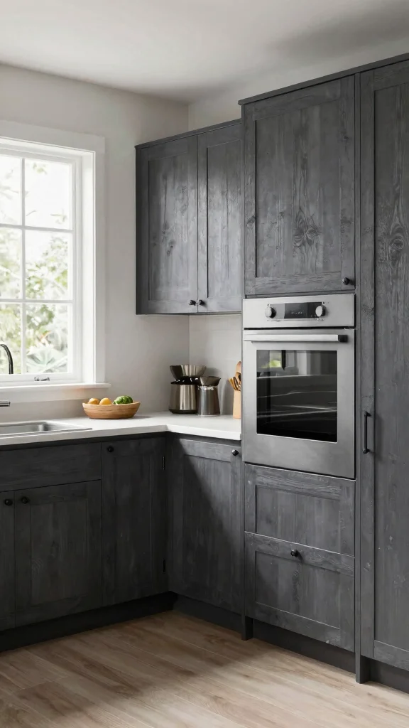 Dark grey kitchen cabinets beautifully complement an industrial style, blending ruggedness with sleek modern elegance. The combination of rough textures and dark tones creates a striking aesthetic that is both sophisticated and inviting.