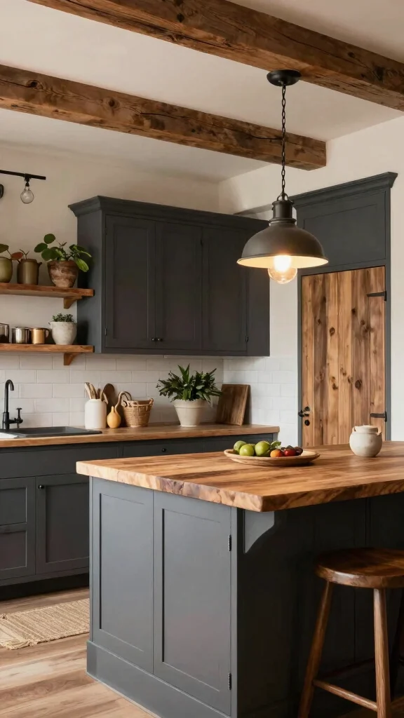 Dark grey cabinets combined with rustic elements can create a warm and inviting kitchen atmosphere. This design beautifully blends modern elegance with cozy charm, featuring exposed beams and reclaimed wood that complement the deep tones of grey. Dark grey serves as a backdrop that highlights natural wood accents, enhancing the overall warmth of the space.