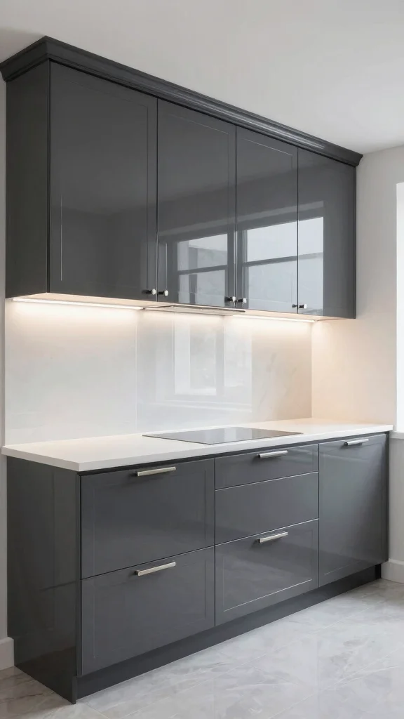To maximize the glamorous effect, use bright accessories or wall colors that contrast with the glossy grey. Incorporate mirrored backsplashes or shiny countertops to amplify the chic vibe, and opt for minimalistic hardware that complements the shine.