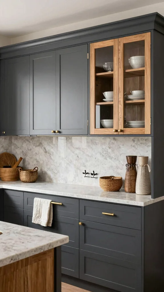 To effectively incorporate mixed materials, use wood accents or stone surfaces for warmth alongside the dark grey. Consider glass fronts to showcase beautiful dishware, and mix matte and glossy finishes for added intrigue.
