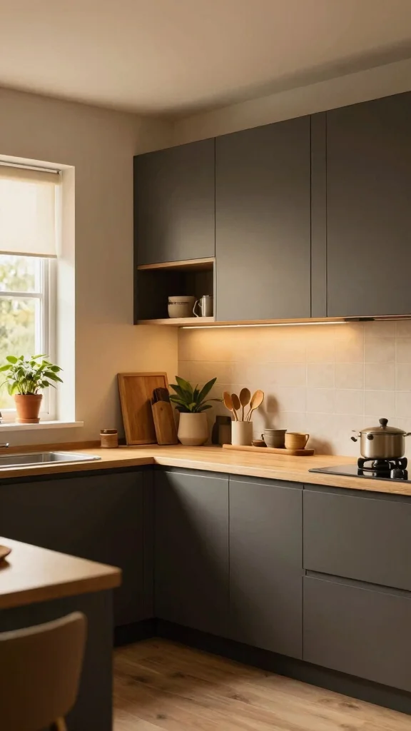 Dark grey kitchen cabinets with warm undertones turn a modern space into a welcoming haven. Pair them with soft yellow lighting and natural textiles, and you’ll feel a cozy vibe that invites family gatherings without losing sleek elegance.