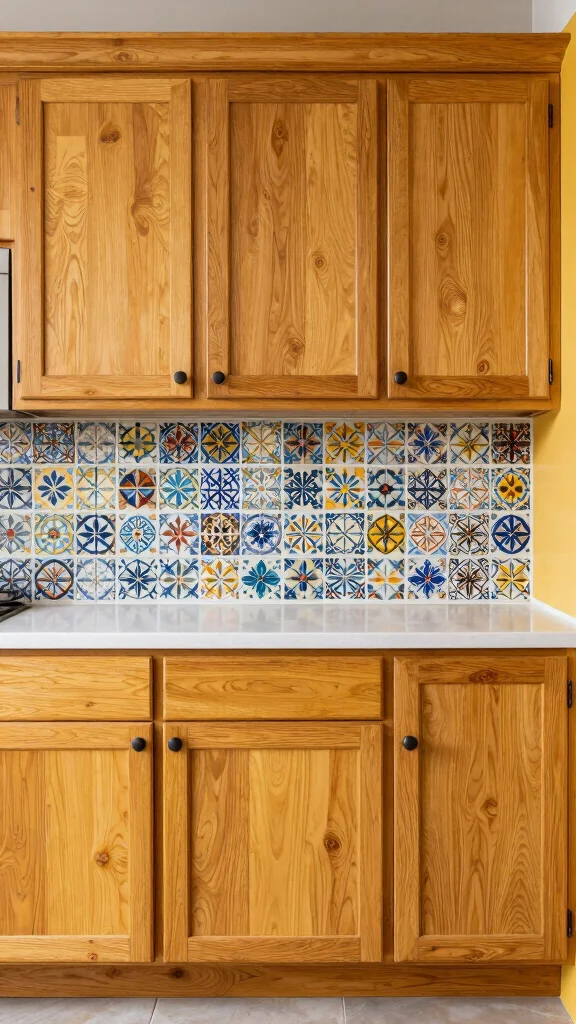 An eye-catching backsplash beautifully enhances your golden oak cabinets, making your kitchen a lively and inviting space.