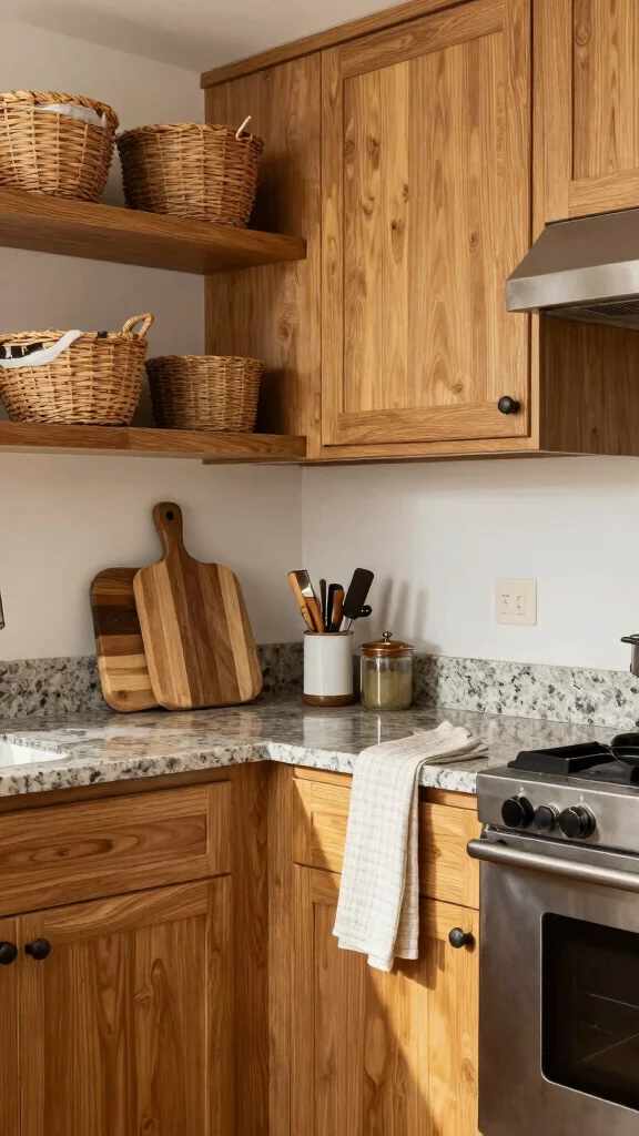 Fun fact: layering 3 textures—wood, stone, and textile—can boost warmth and depth in a kitchen with golden oak kitchen cabinets. Try pairing rough granite, smooth doors, and woven baskets to achieve that rustic-modern, layered look.