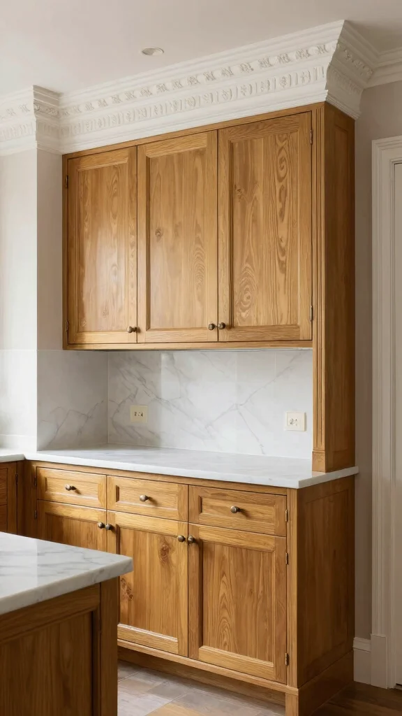 Crown molding can dramatically elevate the aesthetic of your kitchen, giving your golden oak cabinets a sophisticated finish. This simple addition transforms standard cabinetry into a high-end design element. Selecting a crown molding style that complements your decor can create a seamless look throughout your home.