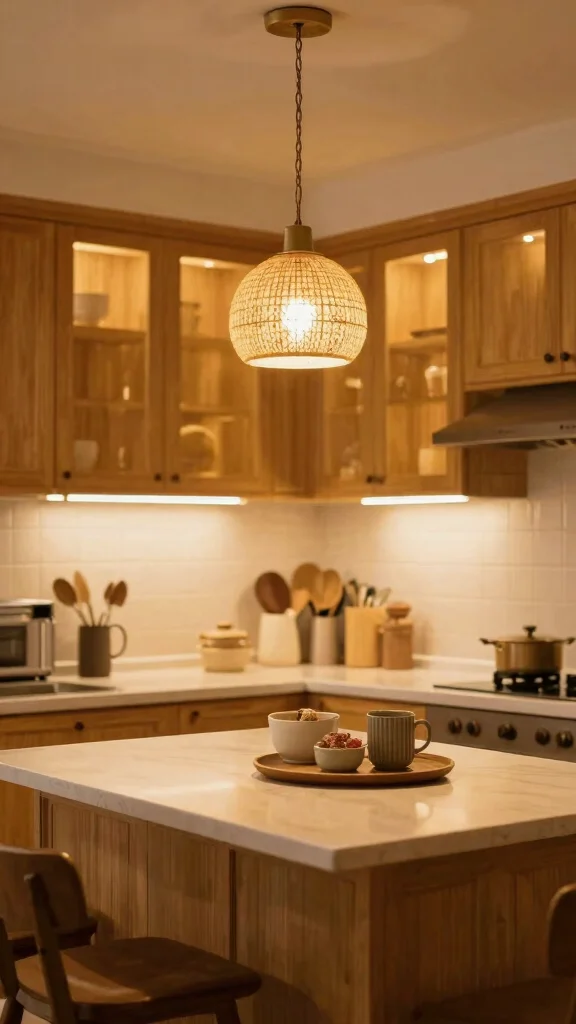 Choosing the right light bulbs is equally important; opt for soft white LED bulbs to cast a gentle glow that makes the space feel inviting. This thoughtful lighting choice can transform the kitchen’s ambiance.