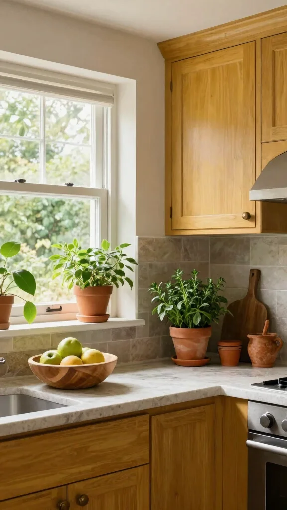 Integrating natural elements into your kitchen can soften the look of golden oak cabinets while embracing a rustic modern theme. Consider adding stone, greenery, or organic shapes to your decor. Items like herb pots on windowsills, wooden fruit bowls, or a stone backsplash can invoke a sense of the outdoors.