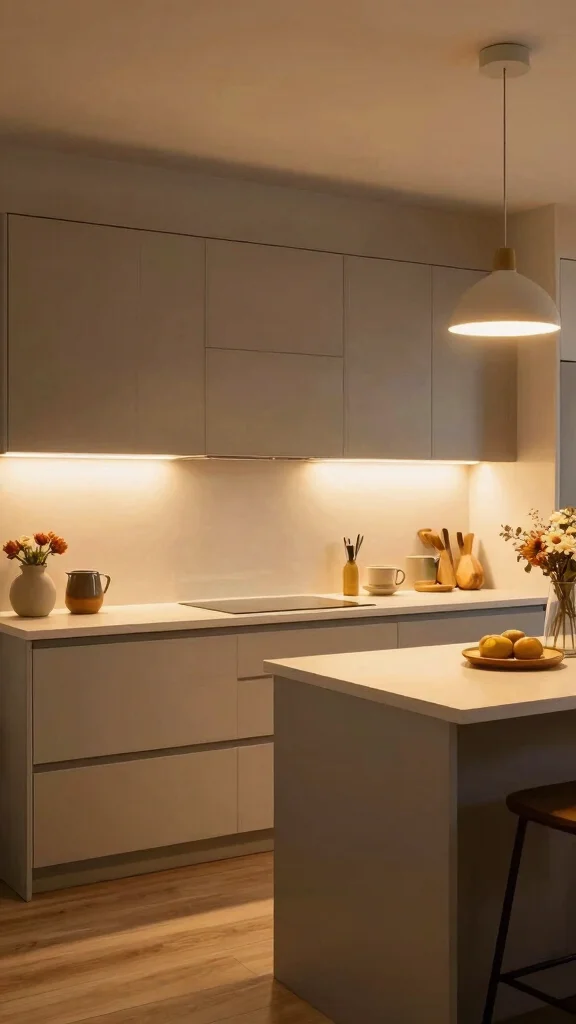 Integrating smart lighting solutions showcases the modernity of light grey cabinetry while ensuring a warm and inviting atmosphere.