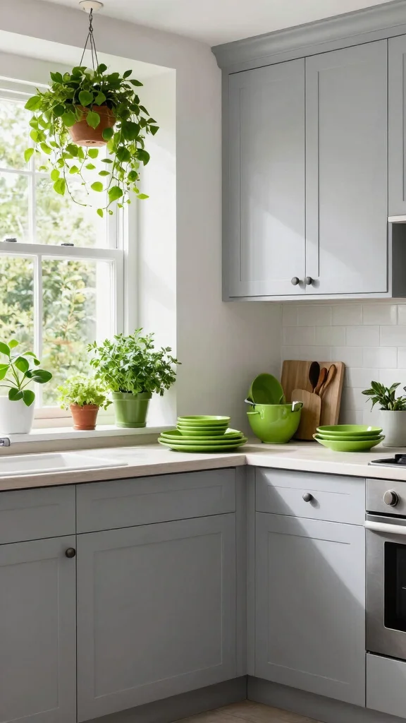 To enhance this look, use varied plant heights for added visual interest. Select green accents that resonate with your overall color scheme to ensure harmony throughout the kitchen.