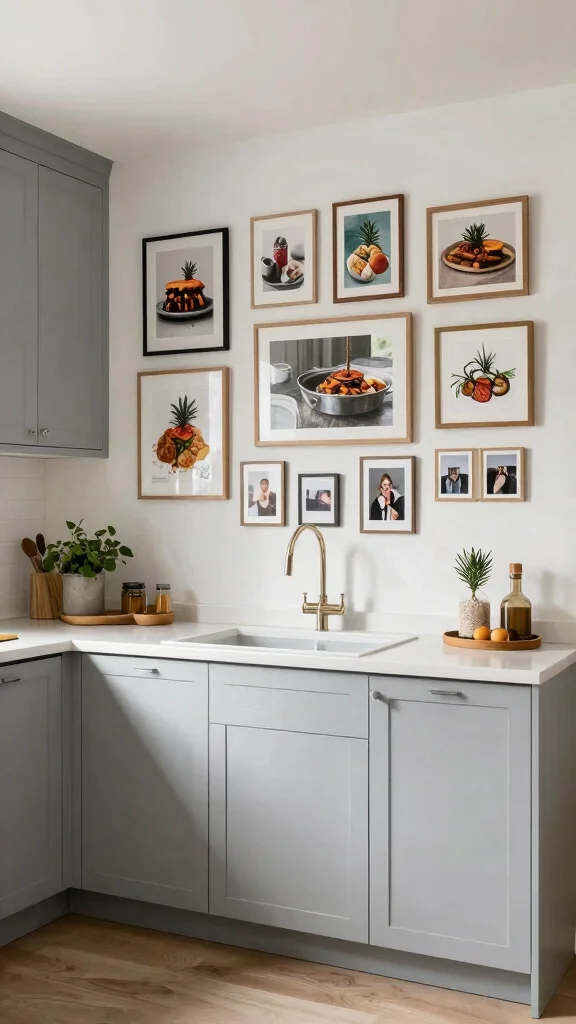 To achieve a dynamic look, use frames of varying sizes for an eclectic feel. Select a color palette for your artworks that harmonizes with the kitchen’s colors to create cohesion.