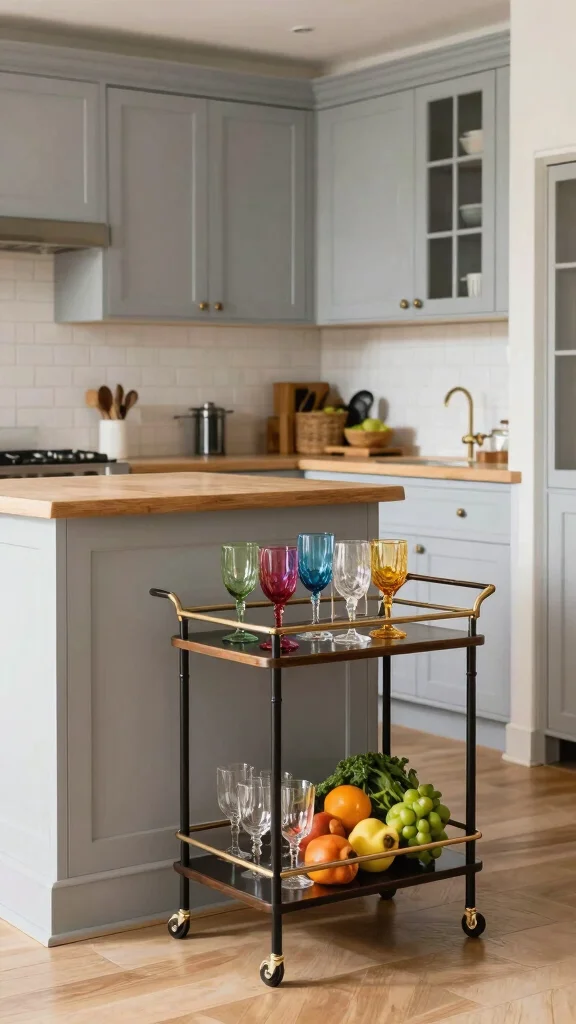 Bar carts upgrade even small kitchens in minutes. Roll one out for entertaining, then swap in colorful glassware and fresh ingredients to keep light grey kitchen cabinets bright and organized.