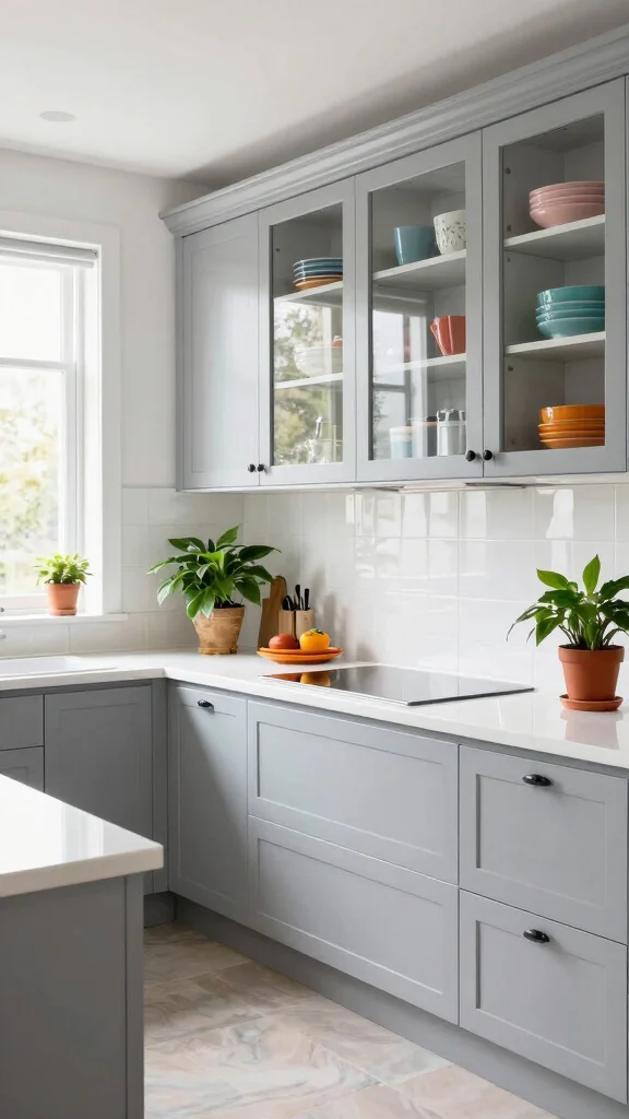 To maximize this aesthetic, consider using glass-front cabinets to showcase your beautiful dishware. Incorporate colorful decor items for a touch of personality that livens up the kitchen. This approach seamlessly blends style and function, creating a timeless ambiance.