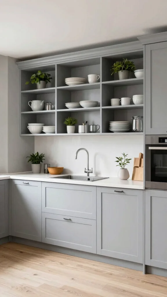 Incorporating open shelving with light grey cabinets is an excellent way to blend practicality with aesthetic appeal. This setup provides easy access to essential kitchen items while allowing you to display beautiful dishware and decor. Floating shelves above the countertop can visually expand the space, creating an inviting and open environment. Opt for natural or painted wood shelves to contrast nicely with the grey cabinetry.