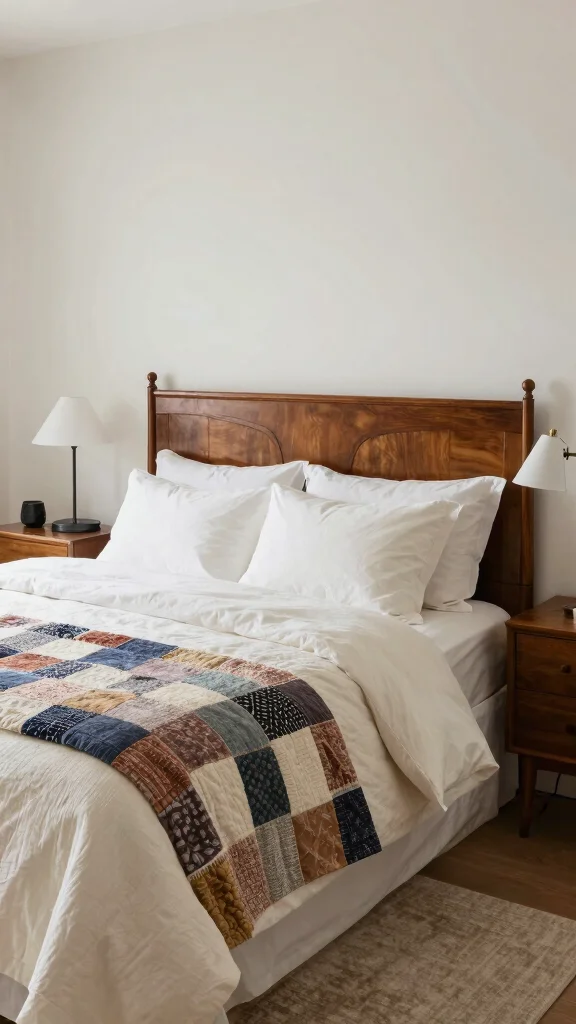 Off white bedding creates a stunning backdrop for blending vintage and modern styles in your bedroom. Pairing antique furniture with contemporary accents generates a delightful contrast that unifies your decor beautifully.