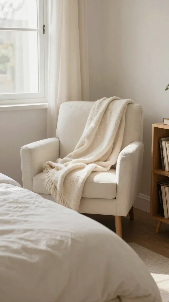 Using light, neutral accessories keeps the space feeling airy and open. A plush off white rug underfoot or a soft throw draped over a chair can enhance warmth and comfort in your bedroom.