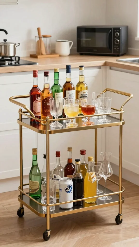 A stylish bar cart can serve as a mobile storage solution in your kitchen. Not only does it keep beverages and glassware organized, but it also adds an elegant touch to your space.