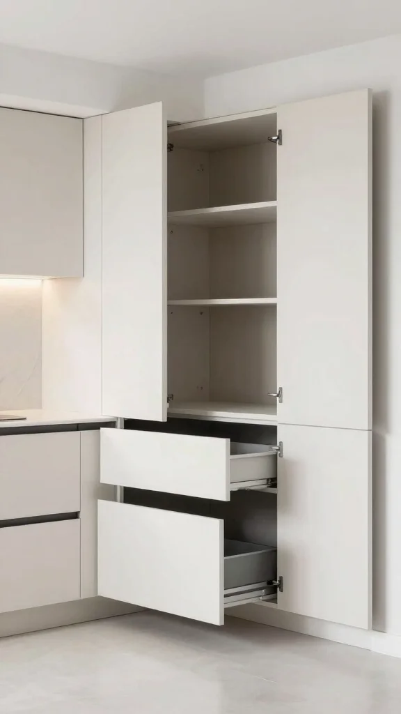 Start with vertical space and hidden storage. Install tall cabinets reaching the ceiling and use interior organizers in drawers. Choose space-saving kitchen solutions like pull-out pantry shelves, deep drawers, and under-cabinet racks to keep surfaces clear.