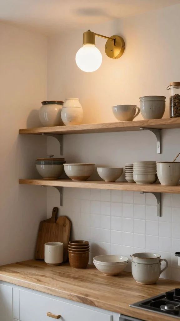 When implementing open shelving, keep your displayed items limited in color to ensure a cohesive appearance. Adding greenery, such as small potted herbs, can also infuse life into the space while maintaining a fresh atmosphere.