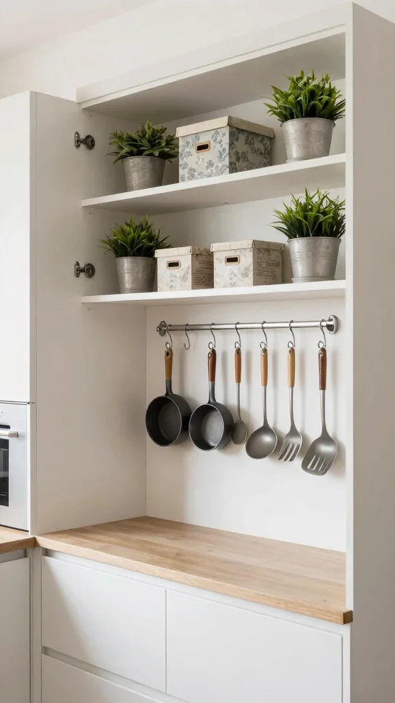 Implementing these smart storage solutions not only keeps your kitchen tidy but also contributes to an airy and efficient cooking space.